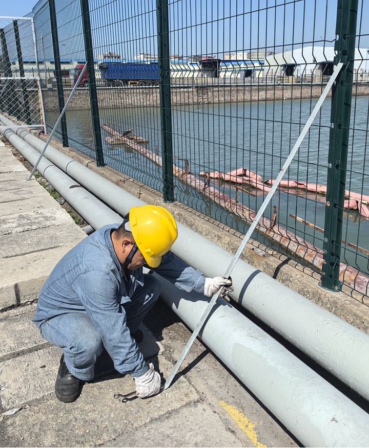碼頭之間周界圍擋是安全管控的重要屏障,也是港口設(shè)施保安工作重要設(shè)施之一。按外委維修方案,需整體制作圍擋,費(fèi)用約8萬(wàn)元。 “能不能自己干?!”黨員維修組現(xiàn)場(chǎng)測(cè)量圍擋尺寸,設(shè)計(jì)“鋼管立柱+鋼絲網(wǎng)格+防撞條”的簡(jiǎn)易圍擋方案,反復(fù)論證可行性后,決定擼起袖子自己干!為確保穩(wěn)固性,黨員維修組用水平儀一米一米測(cè)標(biāo)高,用扳手一顆一顆緊螺栓;為防臺(tái)風(fēng)天氣傾倒,把鋼管底部焊接在混凝土基座,用水平尺校準(zhǔn)“毫米級(jí)”垂直度。5天的連續(xù)作業(yè),為港口經(jīng)營(yíng)公司周界圍擋起整齊牢固的“安全防線(xiàn)”。