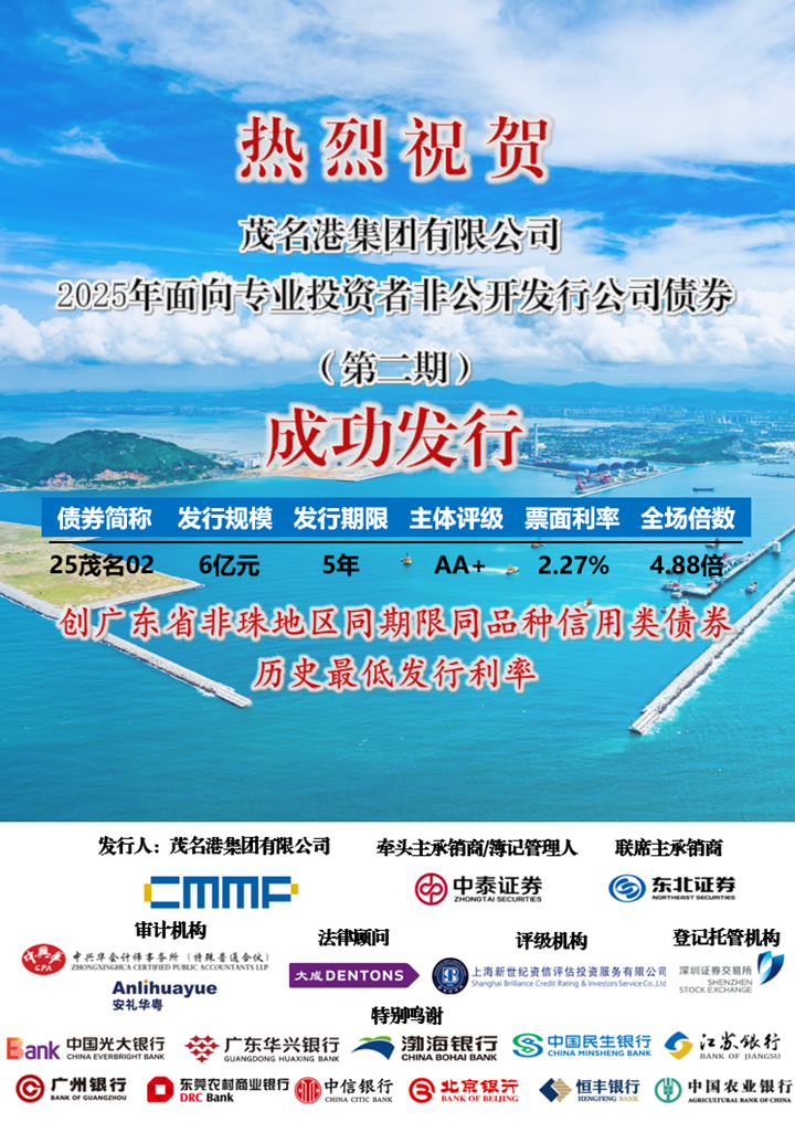 7月3日,茂名港集團在資本市場再度傳來捷報,成功發(fā)行2025年度第二期私募公司債券,發(fā)行規(guī)模6億元。此次發(fā)行票面利率低至2.27%,創(chuàng)歷史新低,不僅進一步優(yōu)化了集團融資結(jié)構(gòu),更為港口業(yè)務(wù)發(fā)展注入強勁動能,彰顯出資本市場對其發(fā)展前景的高度認可。